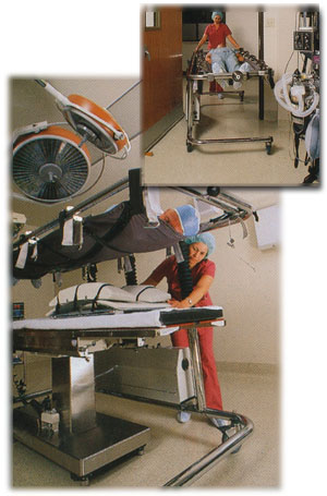 sling. When lifted or transported, the patient is resting
